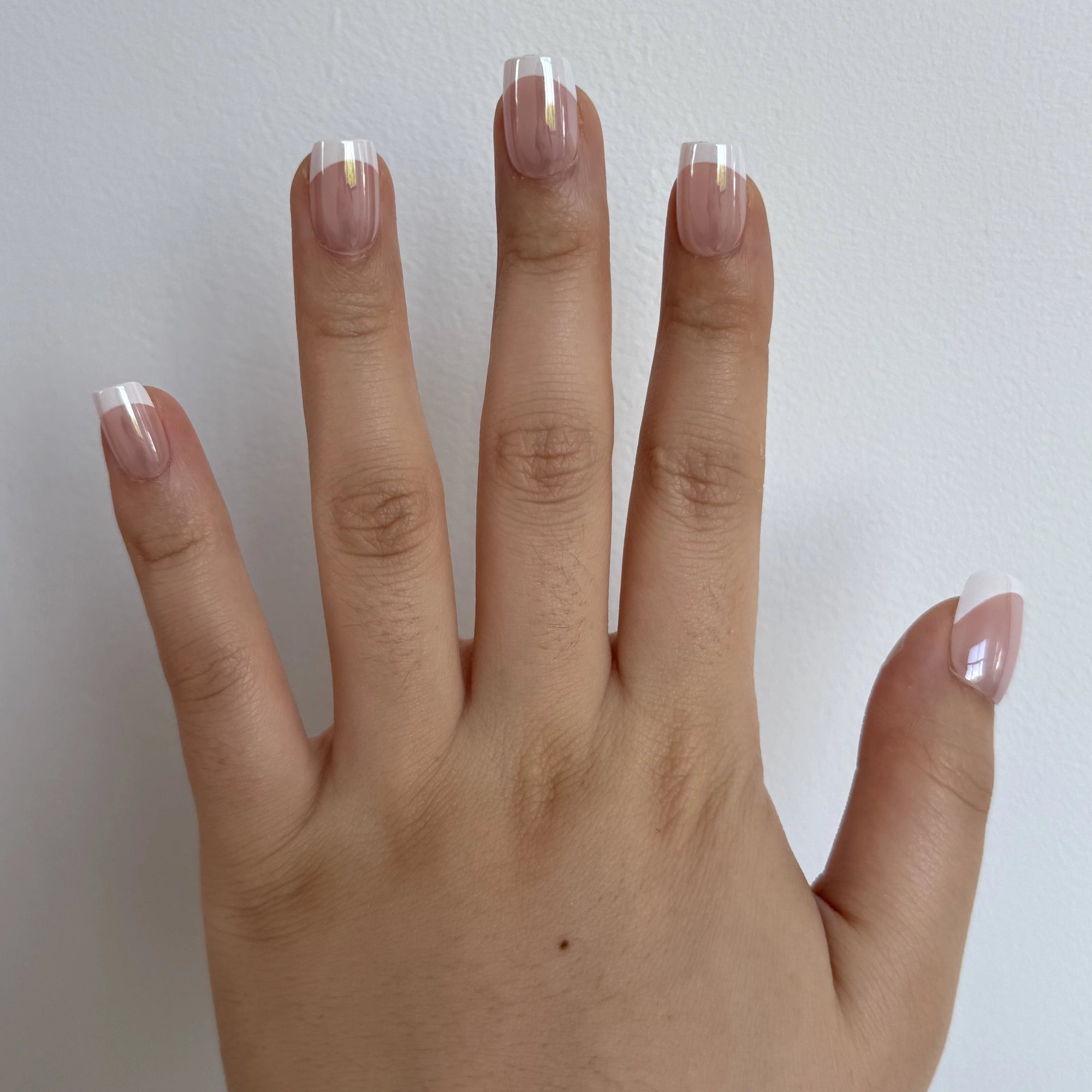 La forme de la French doit suivre celle de l'ongle naturel pour un rendu harmonieux. N'hésitez pas à vous aider de guides adhésifs pour tracer une ligne bien nette et adaptée à la forme de vos ongles.