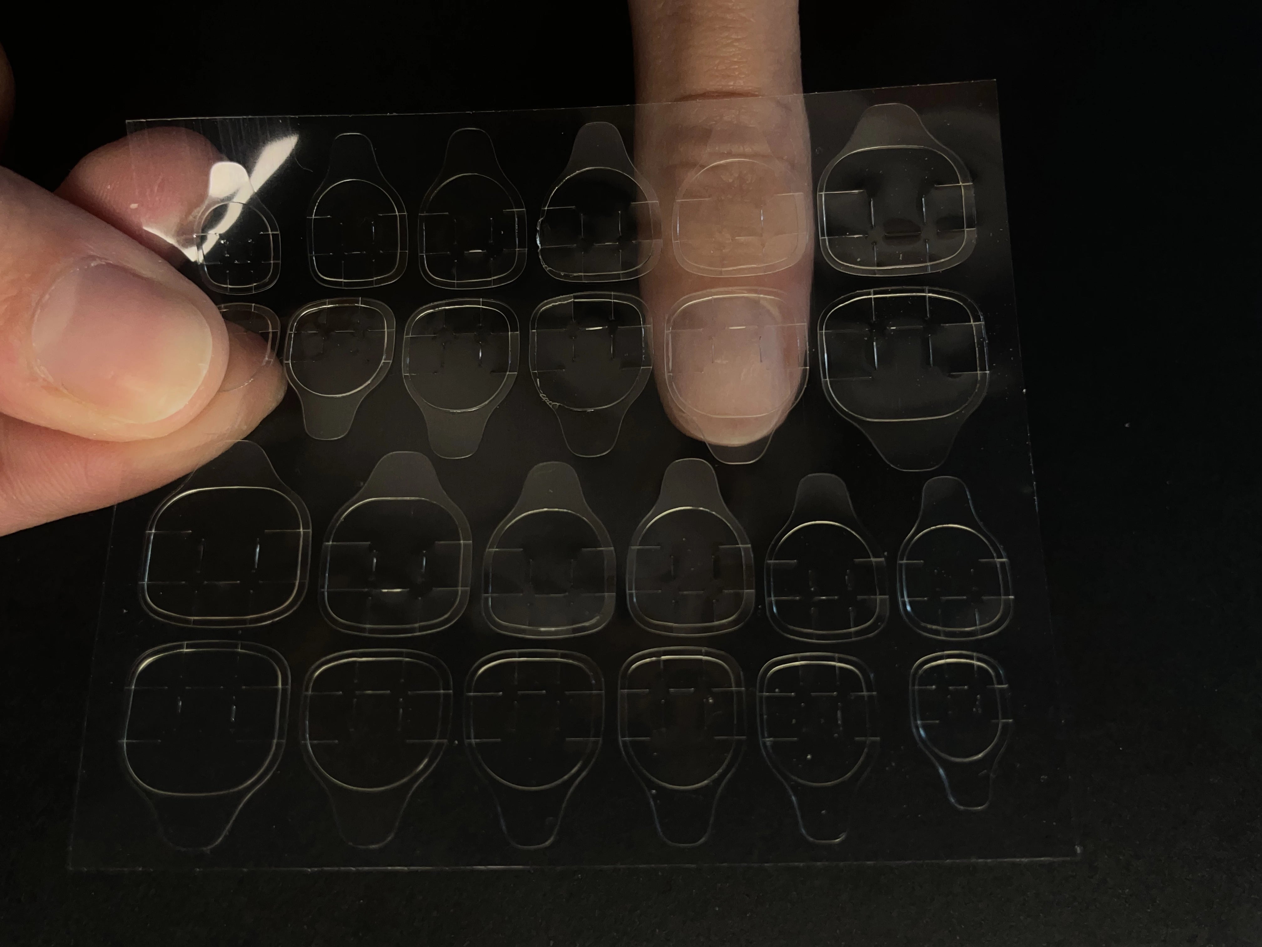 Détachez l'adhésif et placez-le sur votre ongle naturel à environ 1 mm des cuticules. Appuyez fermement pour le fixer.
